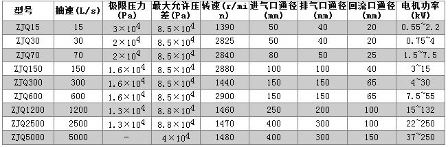 注:表中所列极限压力为该泵单独使用直排大气时的极限压力值,配用前级泵时的极限压力与ZJ系列罗茨真空泵相同,可参照相应的罗茨真空机组的极限压力值。