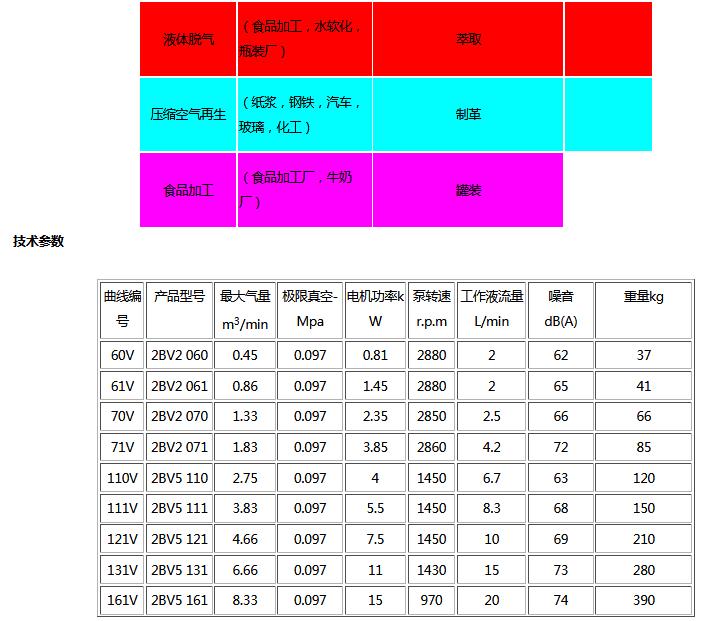 2BV系列真空泵适用于抽除气体和水蒸气,吸气压力可以达到33mbar绝压(97%真空度)。当真空泵在吸气压力低于80mbar的状态下长期工作时,应联接气蚀保护管,以对泵进行保护。如配大气喷射器,吸气压力可达10mbar,喷射器可直接安装在真空泵上。作为压缩机用时,其压力最大至0.26MPa(绝压)。