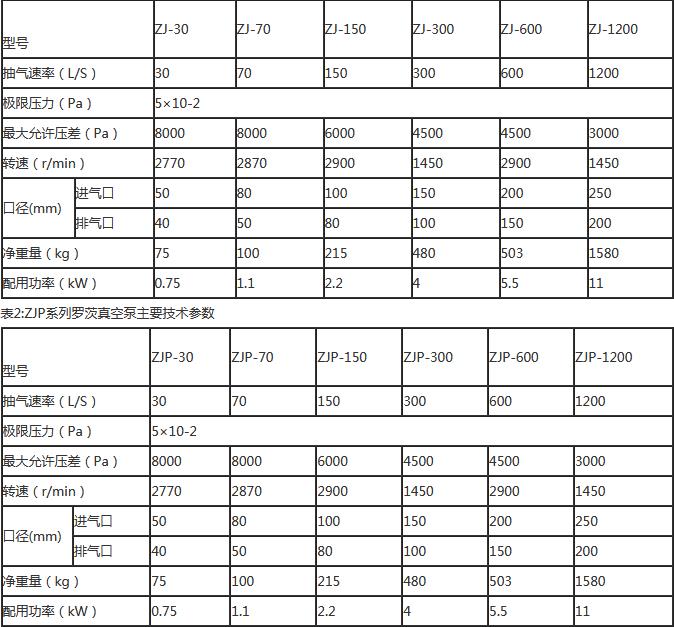 注:1.抽气速率是指在配用推荐前级泵的条件下,罗茨真空泵的入口压强在6650Pa~2.66Pa范围内所测得的最大抽气速率。